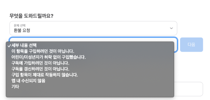3. ‘환불 요청’ 클릭 후 해당 항목 선택