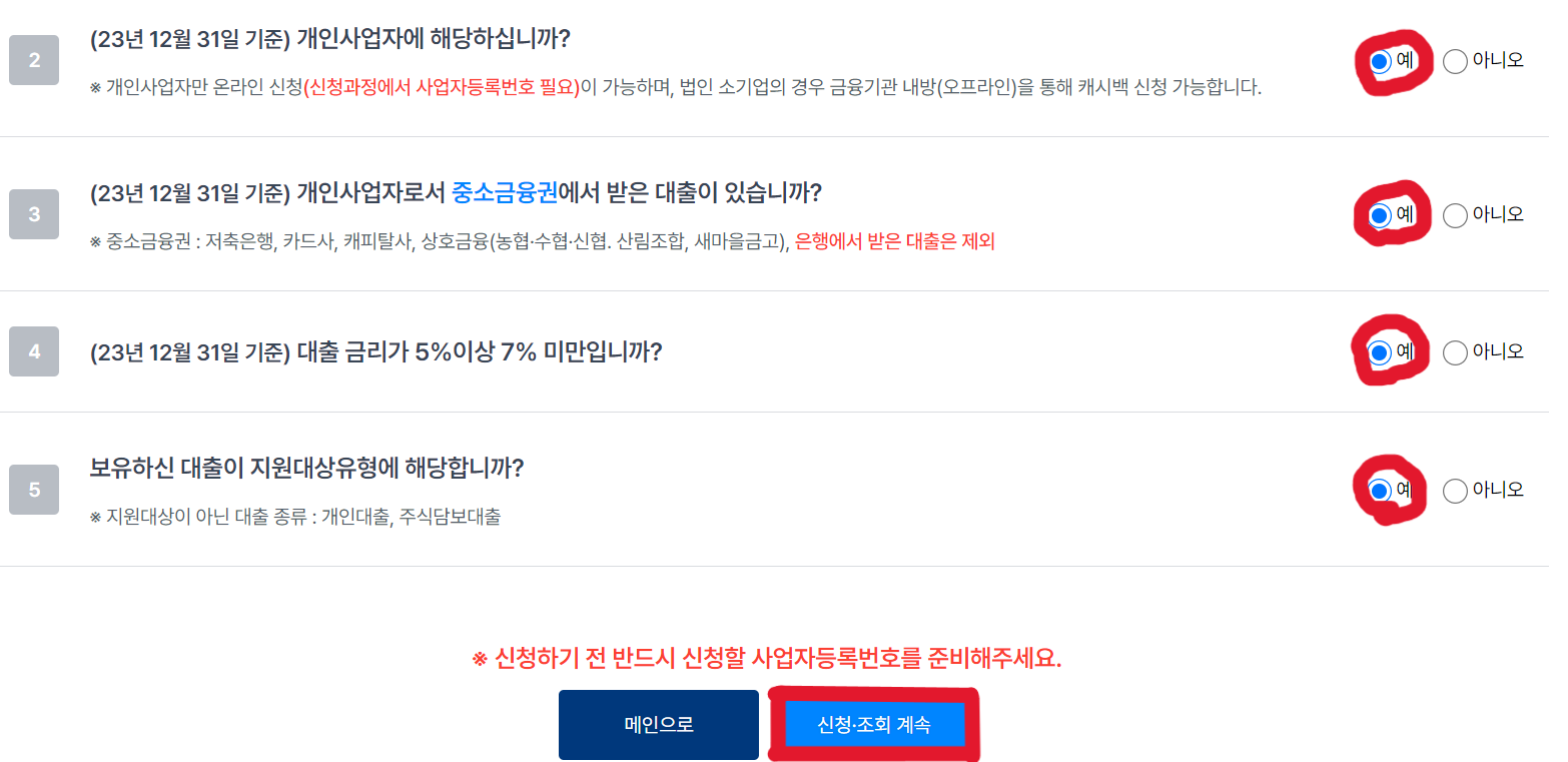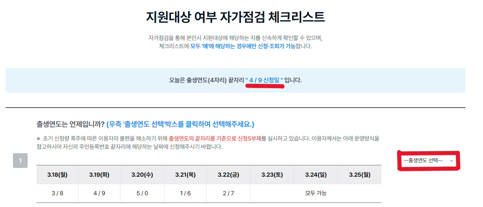 3. 지원 대상 여부 자가 점검 체크리스트가 나옵니다. 출생연도 끝자리에 따라 금요일까지 신청일이 다르니 보시면 자신에게 맞는 출생연도 끝자리의 요일에 신청하실수 있습니다. 하지만 23(토).24(일).25(월)은 모두 가능하니 주말에 신청하셔도 됩니다. 2,3,4,5번의 질문에는 모두 예를 체크 하시고 신청,조회 계속을 눌러 주세요.